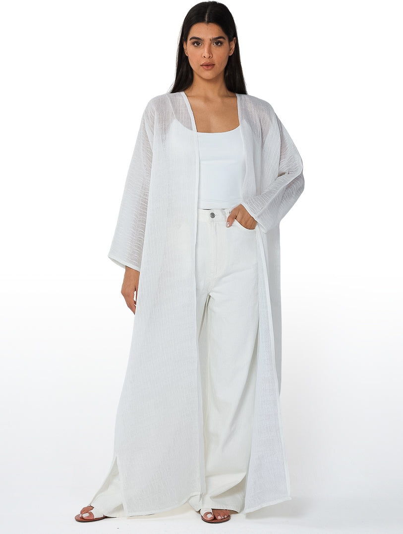 Designed in a breezy linen mix with vertical striping, this abaya keeps things clean and...
