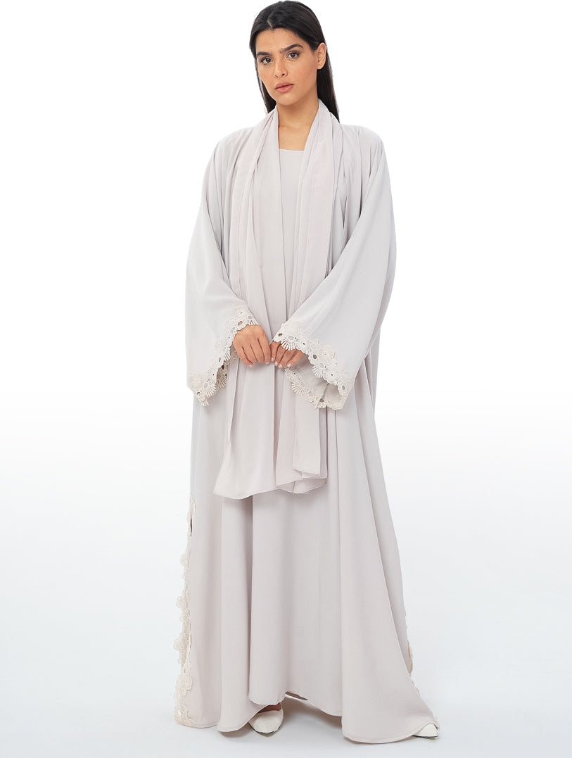 Crafted in soft crepe silk, this abaya features delicate lacework for an elevated daytime feel....