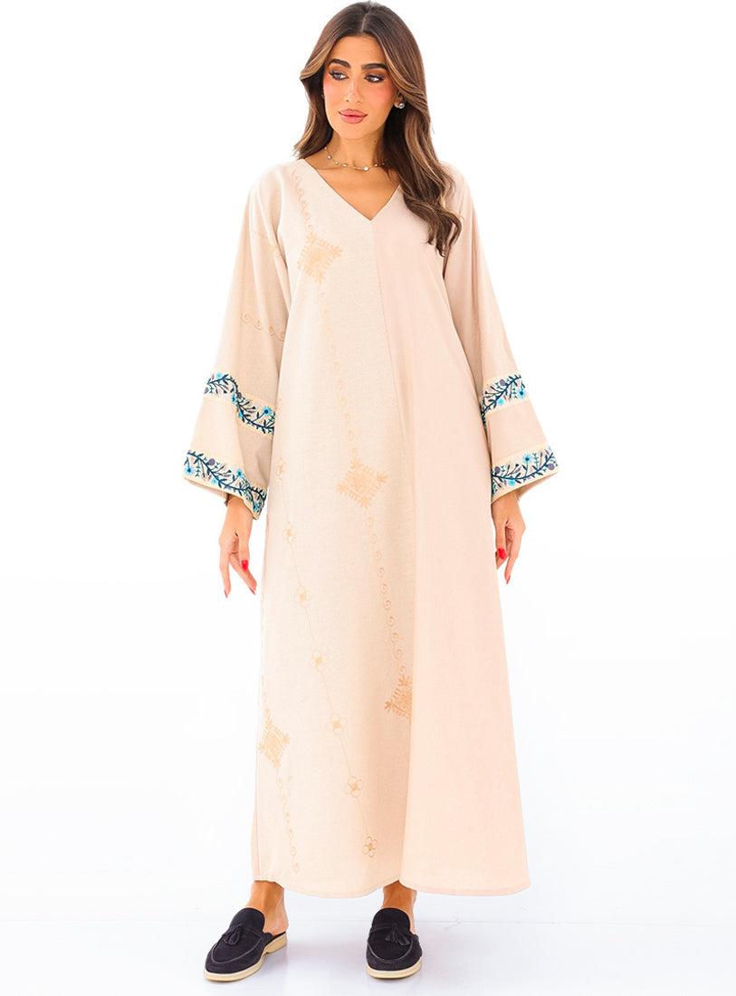 Cut in a natural-toned linen-cotton fabric, this abaya adds understated embroidery for textural depth. Wear...