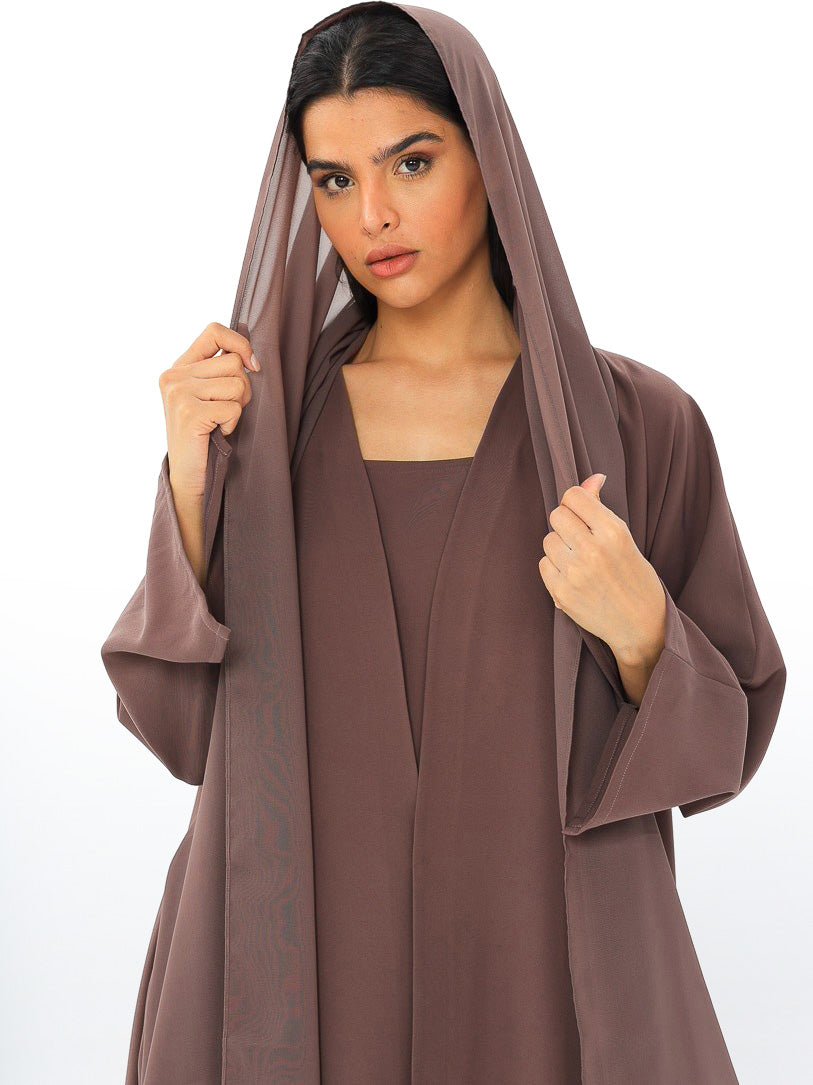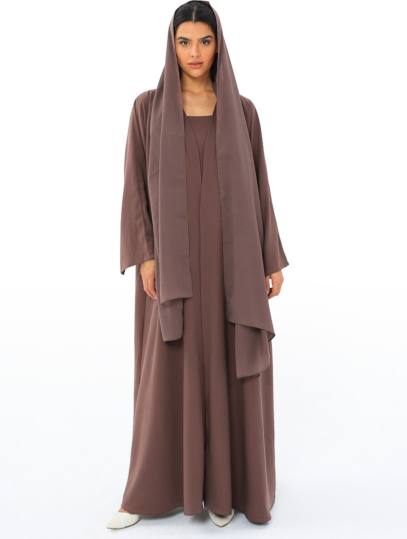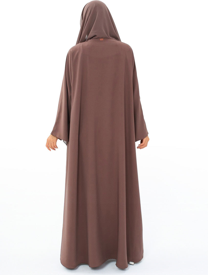 Cut in matte crepe silk, this plain chocolate abaya is your understated go-to. It moves with ease, offers full coverage, and fits right into capsule wardrobes. Perfect for errands, work, and long-day layers.