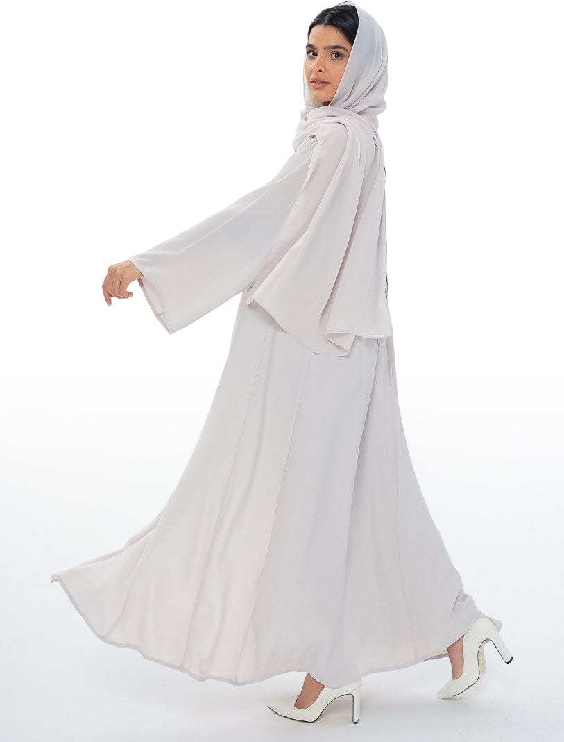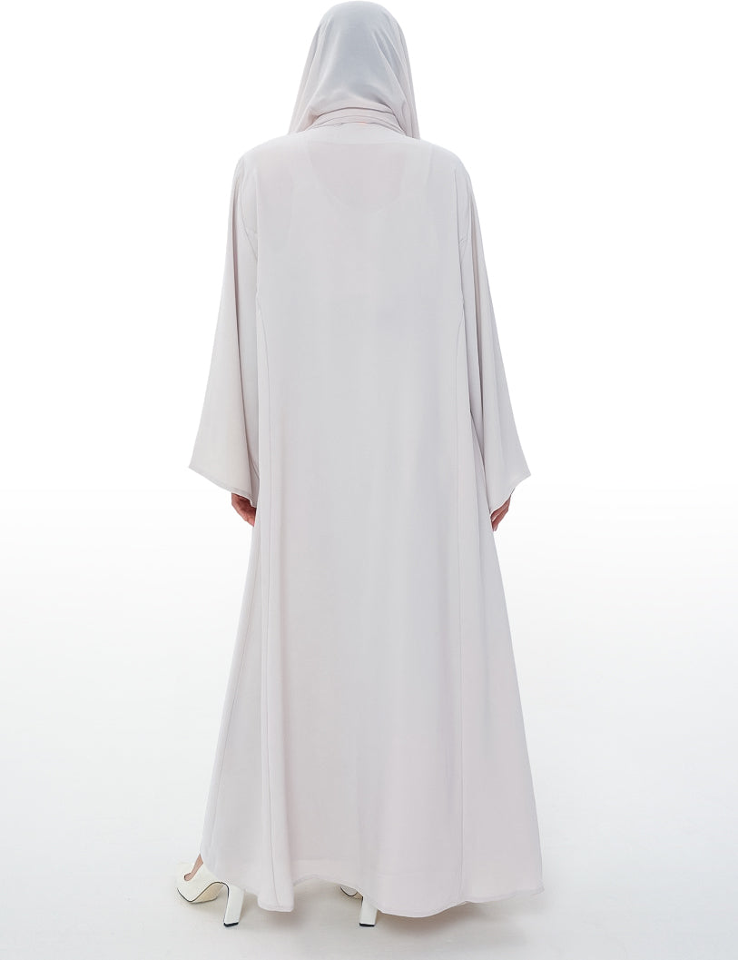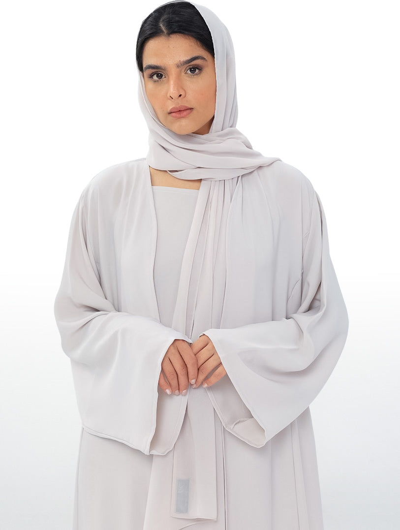 Minimal in every sense, this light grey crepe abaya is designed for all-day comfort. With no embellishment, the flow and fall do the talking. For those who dress slow and style clean.