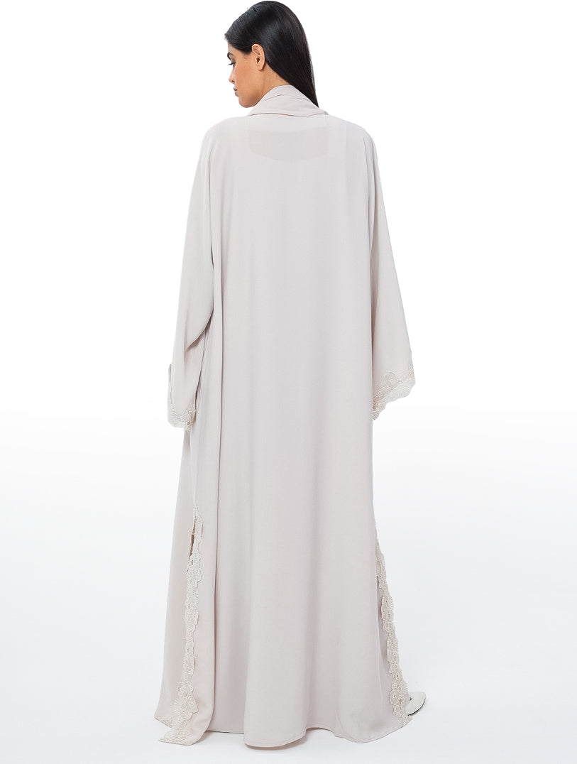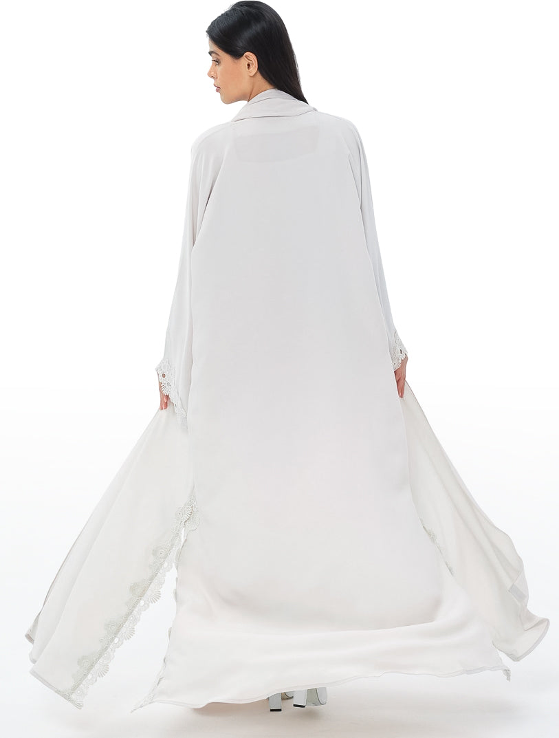 This piece pairs neutral tones with soft lace accents, giving it subtle edge. Crepe silk keeps it breezy, making it suitable for early evenings and semi-formal settings. A quiet statement in movement.