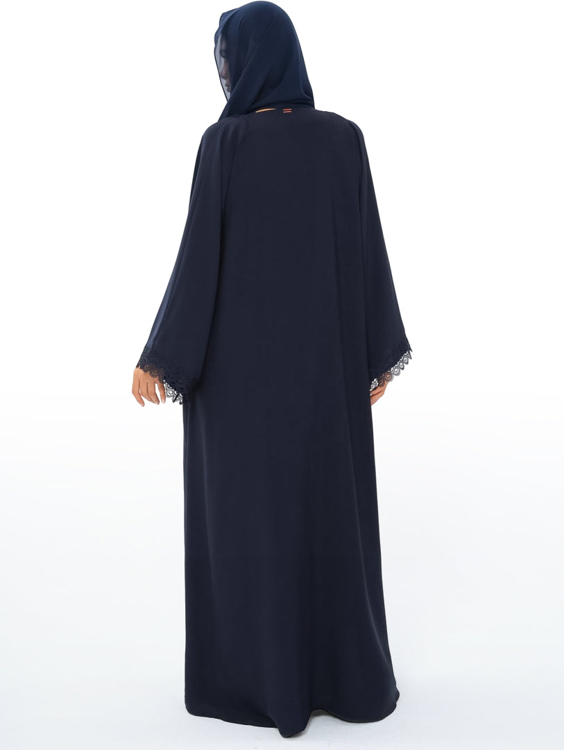 The depth of navy meets the softness of lace in this airy crepe abaya. Perfect for those who love timeless pieces with a hint of texture. Worn best during evenings or semi-formal moments.