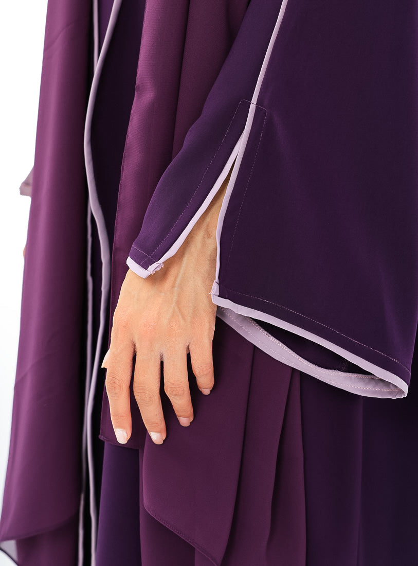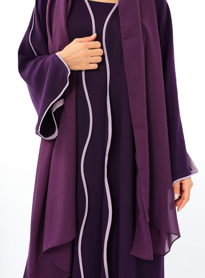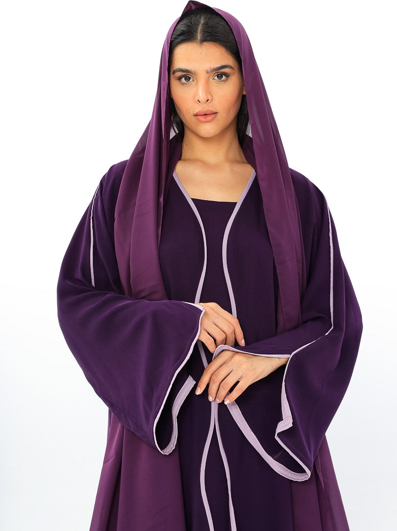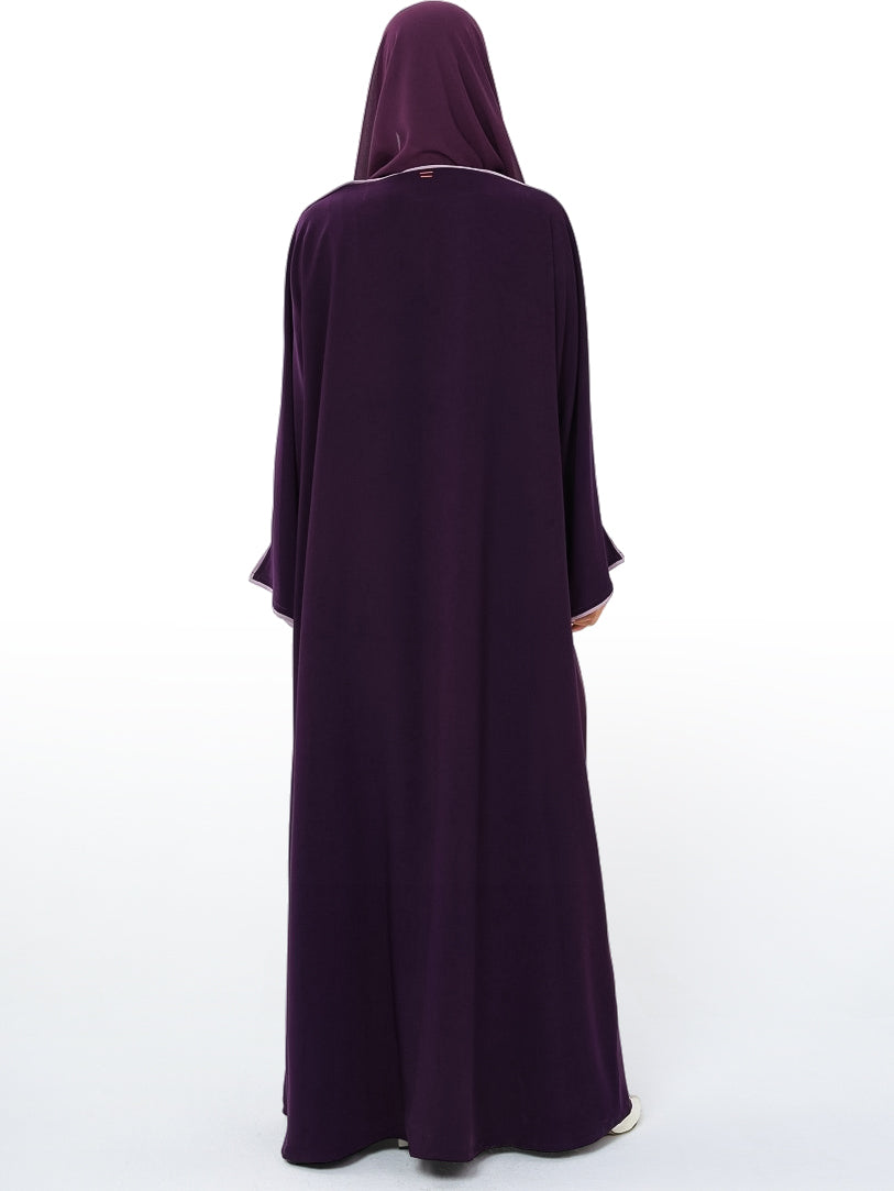 Designed in crepe silk, this abaya features piping work that gives it visual rhythm. The silhouette is clean, the finish is crisp, and the color carries depth. A refined edit for minimalist styling.
