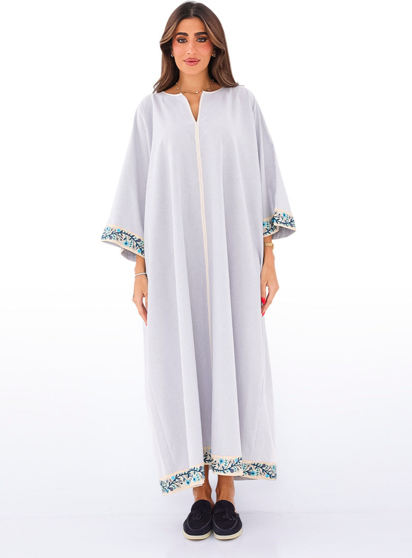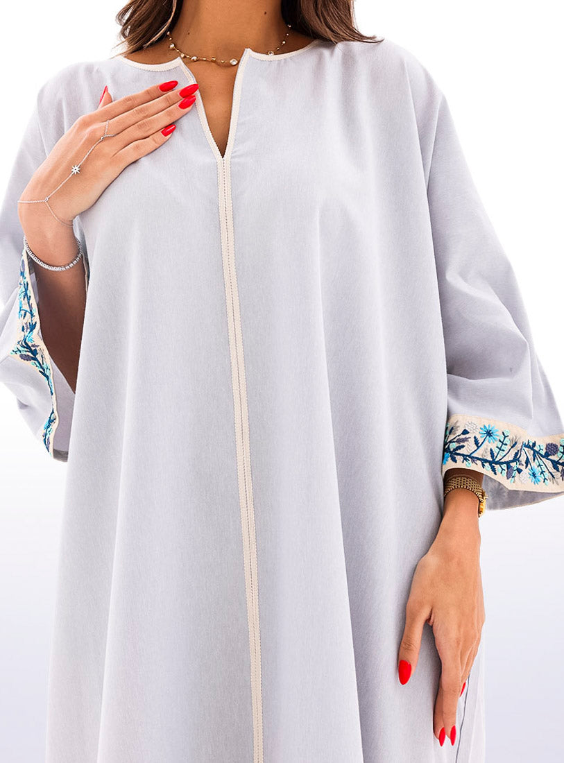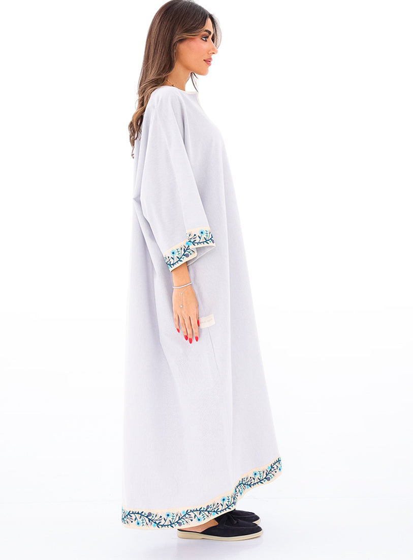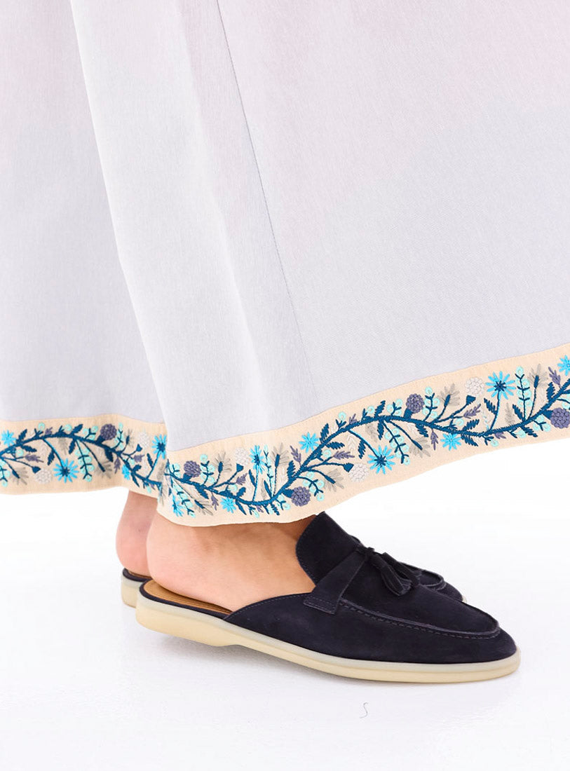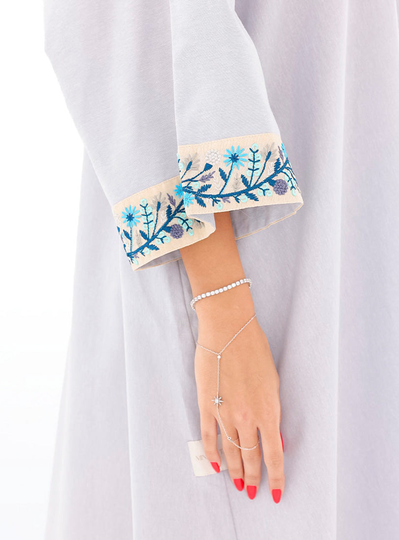 Lightweight cotton–linen blend with delicate lace, offering a breezy and effortless summer feel.