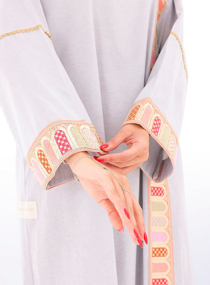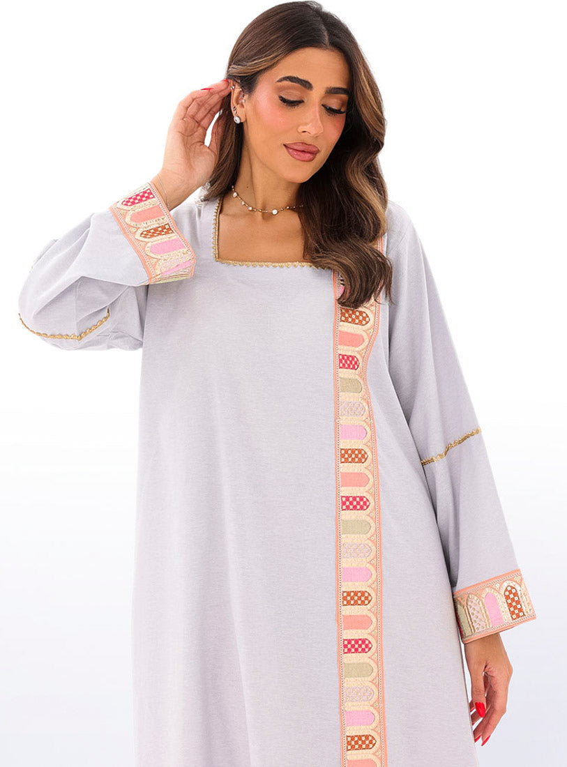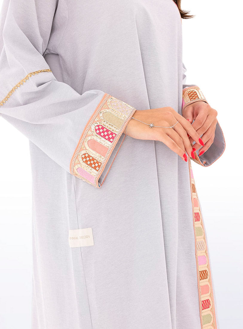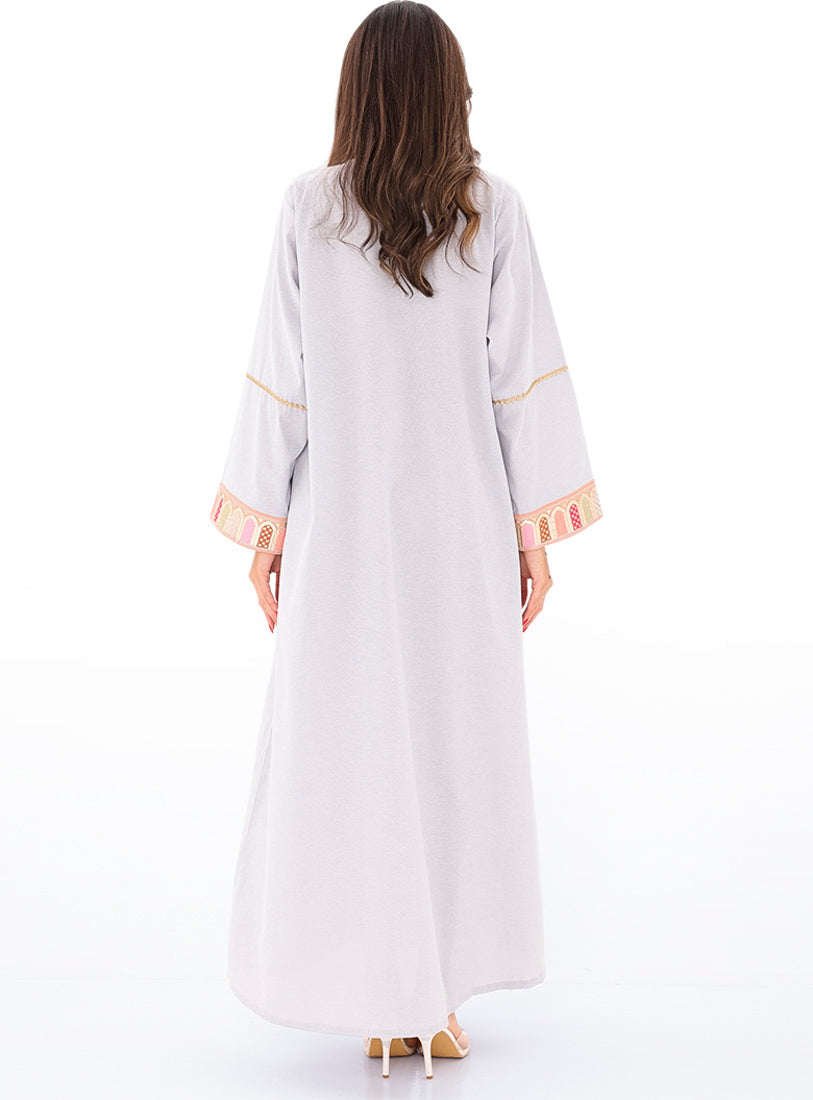 Relaxed-fit kaftan in airy cotton–linen, combining comfort with a touch of feminine lace.